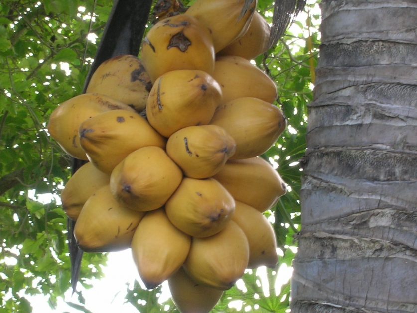 Cocos nucifera ‘Red Spicata Dwarf’ is a distinctive variety of the Coconut Palm. It bears vibrantly-colored (orange, not truly red) seednuts on spiky infructescences. The contrast between Dwarf and Tall Coconut Palms is manifested in at least two ways that are more predictive than height: Dwarf varieties have narrower trunks, and they begin to flower and fruit earlier. For best results with a ‘Red Spicata,’ fertilize generously during the growing season. Like all coconuts, this variety prefers to be grown in full sun.