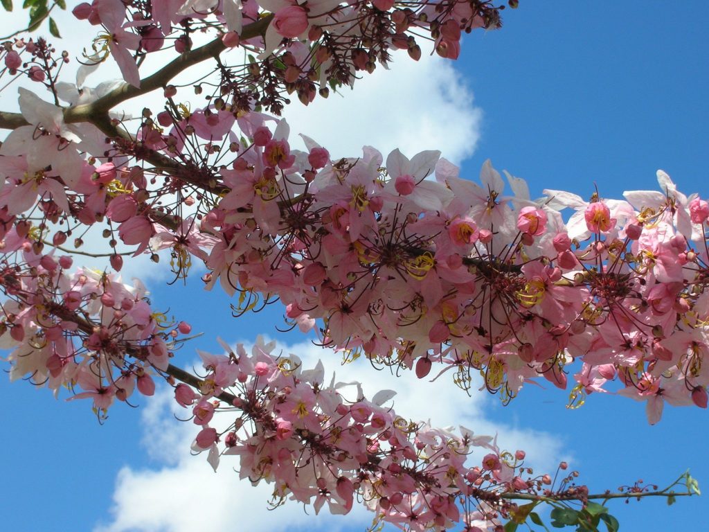 The other tree is the Pink Shower Tree. Actually there are two different species. Cassia bakeriana and Cassia javanica. More than likely, the one everyone is seeing is Cassia bakeriana, as it has bigger and fuller blossoms than the latter. It very much resembles an apple tree in bloom or perhaps a cherry tree if you’ve ever traveled to a northern temperate climate.